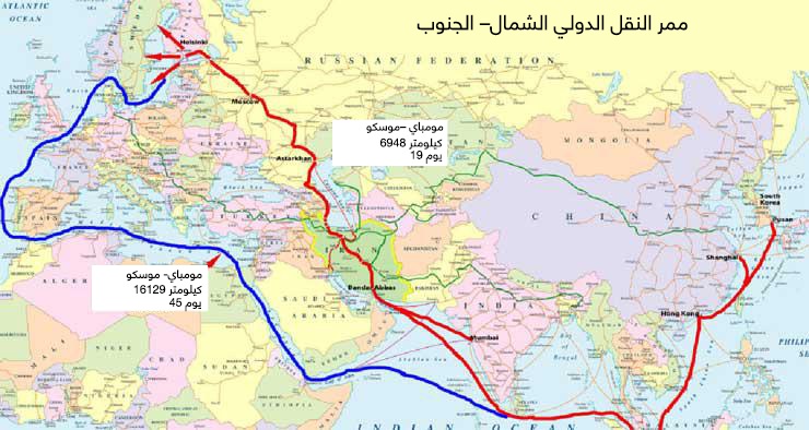 وممر الشحن “شمال ـ جنوب” يربط العاصمة التجارية الهندية مومباي بإقليم أوراسيا مترامي الأطراف. ويتألف من شبكة متعددة الطرق، تبلغ 7200 كيلومتر، من السفن، والسكك الحديدية، والطرق البرية، ويهدف إلى نقل البضائع، والمرور عبر أراضي الهند، وإيران، وأفغانستان، وأرمينيا، وأذربيجان، وروسيا، وآسيا الوسطى، ثم أوروبا الشرقية.