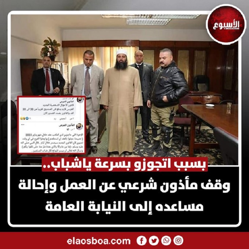 على صعيد متصل أصدرت وزارة العدل في مصر قرارا بوقف مأذون شرعي عن العمل وإحالة مساعده إلى النيابة العامة بعدما دعا الشباب عبر صفحته على فيسبوك للزواج قبل صدور قانون الأحوال الشخصية الجديد الذي يلزم المقدمين على الزواج بدفع مبلغ معين لصالح صندوق دعم الأسرة.